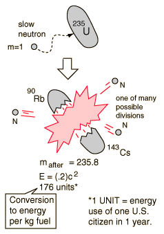 Nuclear FissionIf a massive nucleus like uranium-235 breaks apart (fissions), then there will be a net yield of energy because the sum of the masses of the fragments will be less than the mass of the uranium nucleus. If the mass of the fragments is equal to or greater than that of iron at the peak of the binding energy curve, then the nuclear particles will be more tightly bound than they were in the uranium nucleus, and that decrease in mass comes off in the form of energy according to the Einstein equation. For elements lighter than iron, fusion will yield energy. The fission of U-235 in reactors is triggered by the absorption of a low energy neutron, often termed a "slow neutron" or a "thermal neutron". Other fissionable isotopes which can be induced to fission by slow neutrons are plutonium-239, uranium-233, and thorium-232. ![]()