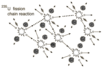 A fission chain reaction produces intermediate mass fragments which are highly radioactive and produce further energy by their radioactive decay. Some of them produce neutrons, called delayed neutrons, which contribute to the fission chain reaction.