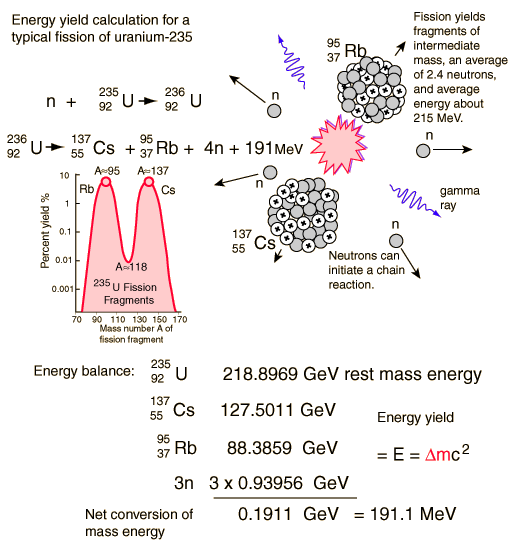 Example of Energy Yield: Uranium-235 FissionNuclear fission of uranium-235 yields an enormous amount of energy from the fact that the fission products have less total mass than the uranium nucleus, a mass change that is converted to energy by the Einstein relationship E = mc2. ![]()