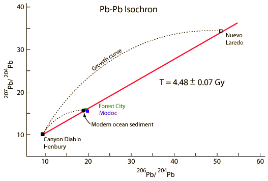 Pb-Pb Isochron Dating![]() After Patterson, 1956 There are a number of useful isotope systems which constitute clocks in the rocks and are useful for geologic dating. But if asked what is the most reliable and precise method for dating the Earth and meteorites, Brent Dalyrymple would point to lead isochrons. He calls the lead method "the hourglass of the solar system". The current approach to plotting Pb-Pb isochrons is referred to as the Holmes-Houtermans method. The above diagram from Patterson represented a major breakthrough in the use of lead isochrons when it was published in 1956. It presented the analysis of three stony meteorites and two iron meteorites and showed that they fell on the same isochron. In addition, it showed that a sample of modern ocean sediment fell on the same isochron. Besides offering confirmation of the meteorite age that had been approached in many studies, it offered evidence that meteorites and the Earth are closely related and of the same age. Like most modern lead age studies, it used the troilite mineral from the Canyon Diablo meteorite as the standard. The isochron age was reported by Patterson as 4.55 Gy, but that becomes 4.48 Gy with the application of the revised decay constants for the isotopes involved.