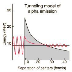 The illustration represents an attempt to model the alpha decay characteristics of polonium-212, which emits an 8.78 MeV alpha particle with a half-life of 0.3 microseconds. The Coulomb barrier faced by an alpha particle with this energy is about 26 MeV, so by classical physics it cannot escape at all. Quantum mechanical tunneling gives a small probability that the alpha can penetrate the barrier. To evaluate this probability, the alpha particle inside the nucleus is represented by a free-particle wavefunction subject to the nuclear potential. Inside the barrier, the solution to the Schrodinger equation becomes a decaying exponential. Calculating the ratio of the wavefunction outside the barrier and inside and squaring that ratio gives the probability of alpha emission.