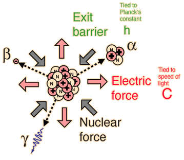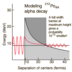 The incredible range of alpha decay half-lives can be modeled with quantum mechanical tunneling. The illustration represents the barrier faced by an alpha particle in polonium-212, which emits an 8.78 MeV alpha particle with a half-life of 0.3 microseconds. The following characteristics of the nuclear environment can be calculated from a basic model of the nucleus: