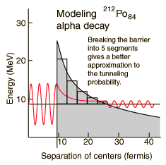 For the modeling of the alpha decay half-life of polonium-212 with the tunneling probability, a value of 0.25 microseconds was obtained. This is surprisingly close to the measured value of 0.3 microseconds, considering that an incorrect barrier can take you off many orders of magnitude. It suggests that the major factors affecting such alpha decay have been accounted for in a reasonable manner.