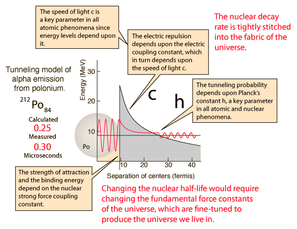 What could you do to change the polonium half-life? The answer is that there is no way to experimentally change that parameter because it ultimately depends upon the values of fundamental physical constants. The illustration below points out that the characteristics which affect the barrier and the tunneling probability are: