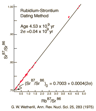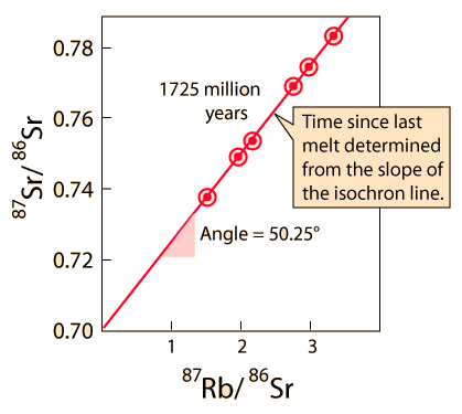 Rubidium-StrontiumThe rubidium-strontium dating method is often used in geologic studies. ![]() This is a rubidium-strontium isochron for a set of samples of a Precambrian granite body exposed near Sudbury, Ontario. The data is from T. E. Krogh, et al., Carnegie Institute Washington Year Book, Vol 66, 1968, p. 530.