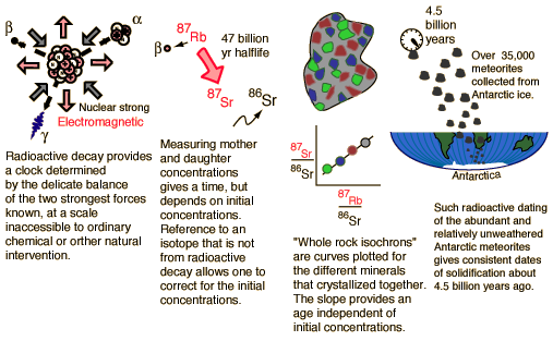 Age of the EarthTo the intriguing question "How old is the Earth?" we can of course only provide models and model calculations based on the best data we can get. While there are numerous natural processes that can serve as clocks, there are also many natural processes that can reset or scramble these time-dependent processes and introduce uncertainties. To try to set a reasonable bound on the age, we could presume that the Earth formed at the same time as the rest of the solar system. If the small masses that become meteorites are part of that system, then a measurement of the solidification time of those meteorites gives an estimate of the age of the Earth. The following illustration points to a scenario for developing such an age estimate. ![]() Some of the progress in finding very old samples of rock on the Earth are summarized in the following comments. "The oldest rocks on earth that have been dated thus far include 3.4 billion year old granites from the Barberton Mountain Land of South Africa, 3.7 billion year old granites of southwestern Greenland, ..." Levin, 1983 But later in 1983: "Geologists working in the mountains of western Australia have discovered grains of rock that are 4.1 to 4.2 billion years old, by far the oldest ever found on the Earth" This dating was done on grains of zircon, a mineral so stable that it can retain its identity through volcanic activity, weathering, and sedimentation. It is a compound of zirconium, silicon and oxygen which in its colorless form is used to make brilliant gems. Samples more than 3.5 billion years old have been found in eight or more locations, including Wisconsin, Minnesota, South Africa, Greenland, and Labrador. Older ages in the neighborhood of 4.5 billion years are obtained from meteoritic samples. The graph below follows the treatment of Krane of Rb-Sr studies of meteorite samples from Wetherill in order to show the nature of the calculation of age from isochrons.