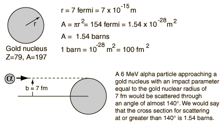 Scattering Cross SectionThe concept of cross section, as its name suggests, is that of effective area for collision. The cross section of a spherical target is ![]() The units of cross section are then area units, but for nuclear scattering the effective area is on the order of the cross sectional area of a nucleus. For a gold nucleus of mass number A=197, the radius determined from the nuclear radius relationship is about 7 fermis. ![]() The most common unit for cross section for nuclear scattering interactions is the barn. The cross section in barns for alpha scattering above a selected angle is a standard part of the analysis of Rutherford scattering. In the case of 6 MeV alpha particles scattered from a gold foil, for example, you don't know the impact parameter for any given alpha particle, so the calculation of the scattered fraction takes on a statistical character. For alpha particles bombarding a gold foil of thicknes 1 micrometer, less than 1 in 100,000 would meet the conditions for scattering at over 140°. The cross section for scattering at smaller angles will be larger, because the alpha doesn't have to come as close to be scattered through the smaller angle. For example, the cross section for scattering through 90° or above is 11.3 barns. For neutron scattering, there is no coulomb repulsion, so there is no appreciable scattering unless the impact parameter is less than the effective radius for the strong interaction. Therefore for a given target geometry the cross sections are smaller, typically measured in millibarns. Since the probability for interaction depends upon the strength and range of the interaction, the cross-sections for neutrino interactions are very small since they interact only by the weak interaction.