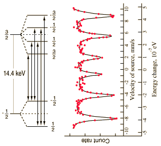 Nuclear Zeeman Effect in Iron-57The incredibly high resolution of the Mossbauer effect in iron-57 makes possible the measurement of the nuclear Zeeman effect for this nucleus. ![]() This data is from O. C. Kistmer and A. W. Sunyar, Physical Review Letters, 4, 412(1960). The energy levels of the iron nucleus, contained in an ordinary iron sample, are split by the nuclear Zeeman effect. The spectrum shows the transitions for iron-57 in an iron oxide lattice. The splittings are some 11 orders of magnitude smaller than the nuclear transition energy! |