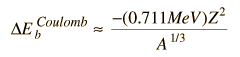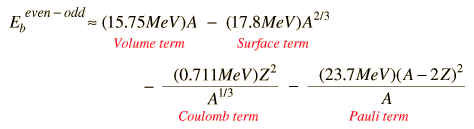 The Weizsaecker FormulaThe Weizsaecker formula is an empirically refined form of the liquid drop model for the binding energy of nuclei. It is also referred to as the "semi-empirical mass formula" and the "Bethe-Weizaecker formula". Expressed in terms of the mass number A and the atomic number Z for an even-odd nucleus, the Weizsaecker formula is ![]() Using the even-odd as a reference, there are then correction terms for even-even and odd-odd nuclei, the even-even groupings of protons and neutrons being favored in stability. ![]() ![]()