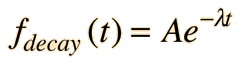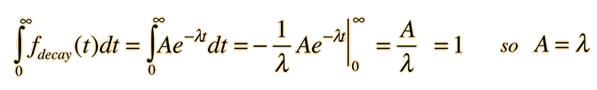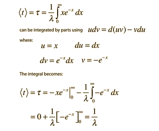 Mean Lifetime for Particle DecayThe decay of particles is commonly expressed in terms of half-life, decay constant, or mean lifetime. The probability for decay can be expressed as a distribution function ![]() To normalize this distribution function: ![]() The probability that a given particle will decay within time t is given by the integral of the decay distribution function from 0 to t. This is not the quantity which we wish to calculate - we want the average time the particle will exist without decaying. The probability that a particle is not decayed is one minus the probability that it will decay. The probability that a particle will remain at time t is then: ![]() The average survival time is then the mean value of time using this probability function. ![]() This integral may be evaluated by integration by parts. It is made slightly more direct by the substitution x = λt: ![]() So the mean lifetime for particle decay is given by ![]() Any quantity A which depends upon this decay can then be expressed as
