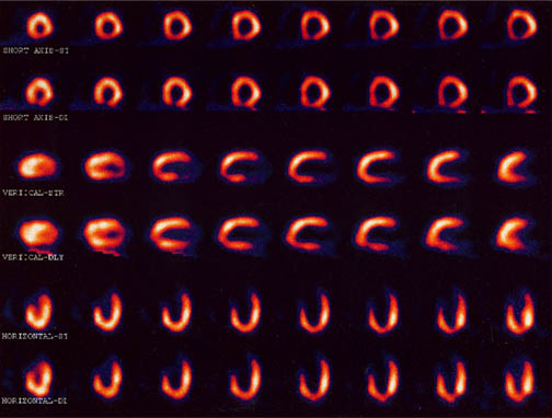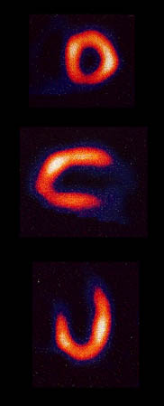 Myocardial Infusion ImagingA widely used diagnostic procedure for heart health is the imaging of the blood infusion to the heart using a low dose of a radioactive tracer in the blood. A large radiation detector rotates about the chest of the patient, detecting gamma radiation from the tracer element which has been injected into the patient's vein. The image shows the perfusion of the blood into the heart muscle.