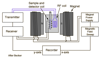 Nuclear Magnetic ResonanceWhen the nuclear magnetic moment associated with a nuclear spin is placed in an external magnetic field, the different spin states are given different magnetic potential energies. In the presence of the static magnetic field which produces a small amount of spin polarization, a radio frequency signal of the proper frequency can induce a transition between spin states. This "spin flip" places some of the spins in their higher energy state. If the radio frequency signal is then switched off, the relaxation of the spins back to the lower state produces a measurable amount of RF signal at the resonant frequency associated with the spin flip. This process is called Nuclear Magnetic Resonance (NMR). A magnetic dipole moment (usually just called "magnetic moment") in a magnetic field will have a potential energy related to its orientation with respect to that field. ![]() Note that the electron spin magnetic moment is opposite to the electron spin while the proton spin magnetic moment is in the direction of the proton spin. The electron spin or proton spin will tend to precess around the magnetic field with a frequency traditionally called the Larmor frequency. For a 1 Tesla magnetic field this Larmor frequency would be ![]() The Larmor frequency can be visualized classically in terms of the precession of the magnetic moment around the magnetic field, analogous to the precession of a spinning top around the gravity field. It can also be visualized quantum mechanically in terms of the quantum energy of transition between the two possible spin states for spin 1/2. This can be expressed as a photon energy according to the Planck relationship. The magnetic potential energy difference is hn = 2mB. The short table of Larmor frequencies below is from Hobbie, Ch 17 and Becker. An extensive list including the magnetic moments and Larmor frequencies of most elements can be found in Appendix A of Becker.