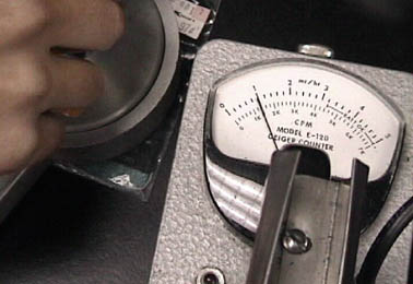 Until recently, a number of marketed products had considerable levels of radioactivity. Shown with the Geiger counter are a piece of orange "Fiestaware", a mantle from a camping lantern, and No Salt salt substitute. The orange dish gains its radioactivity from uranium oxides in the orange glaze. This dish measured 20 millirad /hour when the counter was placed directly on it. The mantle measured 9 mr/hr. The No Salt has a lower level of radioactivty from the potassium chloride it contains, measuring 0.2 mr/hr.
