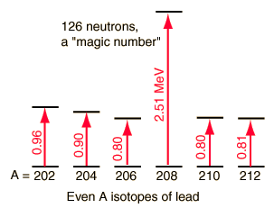 Nuclear Excitation EnergiesOne of the ways to measure the stability of nuclear ground states is to measure the energy necessary to raise it to its first excited state. The excitation energies for the even-A isotopes of lead are shown, and the required energy is dramatically larger for the isotope which has a magic number of neutrons. This is strong evidence for a shell model of the nucleus. ![]() The isotope lead-208 is particularly unique in being "doubly magic" with Z=82 and N=126.
