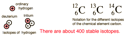 IsotopesThe different isotopes of a given element have the same atomic number but different mass numbers since they have different numbers of neutrons. The chemical properties of the different isotopes of an element are identical, but they will often have great differences in nuclear stability. For stable isotopes of light elements, the number of neutrons will be almost equal to the number of protons, but a growing neutron excess is characteristic of stable heavy elements. The element tin (Sn) has the most stable isotopes with 10, the average being about 2.6 stable isotopes per element. ![]() Information about the isotopes of each element and their abundances can be found by going to the periodic table and choosing an element. Then take the link to nuclear data. Isotopes are (almost) Chemically IdenticalIt is significant to note that the three isotopes of hydrogen change in mass by a factor of three, but their chemical properties are virtually identical. A tiny difference in the spectral frequencies of hydrogen and deuterium comes from an essentially mechanical source, the slight change in the "reduced mass" associated with the orbiting electron. But for practical purposes the chemical behavior of the isotopes of any element are identical. The dominant contributer to the interactions between atoms and their environment is the electromagnetic force. It should not be surprising that an extra neutron or two in the nucleus has almost no effect on that interaction with the world. Examination of a scale model of the atom makes it evident that the nucleus is extremely tiny compared ot the size of the atom. The nuclear radius of carbon-12 is 2.7 x 10-15 m while the size of the atom from the periodic table is about 0.9 x 10-10 m, about 33,000 times larger!