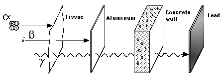 Penetration of MatterThough the most massive and most energetic of radioactive emissions, the alpha particle is the shortest in range because of its strong interaction with matter. The electromagnetic gamma ray is extremely penetrating, even penetrating considerable thicknesses of concrete. The electron of beta radioactivity strongly interacts with matter and has a short range. ![]() |