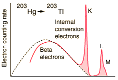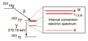 An example used by Krane is that of 203Hg, which decays to 203Tl by beta emission, leaving the 203Tl in an electromagnetically excited state. It can proceed to the ground state by emitting a 279.190 keV gamma ray, or by internal conversion. In this case the internal conversion is more probable. Since the internal conversion process can interact with any of the orbital electrons, the result is a spectrum of internal conversion electrons which will be seen as superimposed upon the electron energy spectrum of the beta emission. The energy yield of this electromagnetic transition can be taken as 279.190 keV, so the ejected electrons will have that energy minus their binding energy in the 203Tl daughter atom.