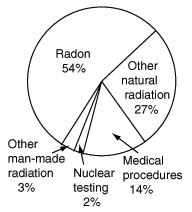 Radon compared to other radiation sourcesThe "action level" recommended by the Environmental Protection Agency for radon in the air is 4 picocuries/liter of air. It is difficult to convert air concentrations to actual exposures in rems or sieverts, but estimates are in the range of 4 to 14 rem per year at that concentration. That makes it greater that all the other routine environmental exposures combined.