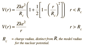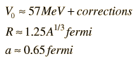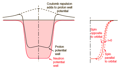 Nuclear Potential and the Shell ModelThe shell model of the nucleus presumes that a given nucleon moves in an effective attractive potential formed by all the other nucleons. If that is true, then the potential is probably roughly proportional to the nuclear density and therefore could be expressed in the form ![]() The parameters in this model of the potential have been evaluated to be approximately evaluated: ![]() Note that the radius above is larger than that given by the nuclear radius formula since it is related to the nuclear force which extends beyond the radius. Two other corrections are typically applied to more nearly fit observations. The first is called the symmetry energy, arising when there is an unequal number of protons and neutrons. Empirically, it is evaluated as ![]() The other correction for protons is the electrostatic repulsion energy, which takes the form ![]() The approximate potentials for neutrons and protons take the general form shown at left below. ![]() The additional correction which must be made is the spin-orbit interaction. It's general effect on the potential well is shown in the sketch above right. If the spin is opposite to the orbital angular momentum, the effective potential well is narrower, giving higher energy in the same manner as the square well potential. This can be seen in the spin-orbit splittings in the shell model level diagram.