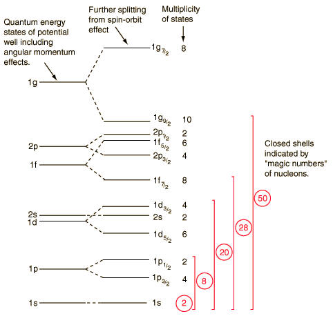 Shell Model of NucleusVisualizing the densely packed nucleus in terms of orbits and shells seems much less plausible than the corresponding shell model for atomic electrons. You can easily believe that an atomic electron can complete many orbits without running into anything, but you expect protons and neutrons in a nucleus to be in a continuous process of collision with each other. But dense-gas type models of nuclei with multiple collisions between particles didn't fit the data, and remarkable patterns like the "magic numbers" in the stability of nuclei suggested the seemingly improbable shell structure. With the enormous strong force acting between them and with so many nucleons to collide with, how can nucleons possibly complete whole orbits without interacting? This has the marks of a Pauli exclusion principle process, where two fermions cannot occupy the same quantum state. If there are no nearby, unfilled quantum states that are in reach of the available energy for an interaction, then the interaction will not occur. This is a essentially quantum idea - if there is not an available "hole" for a collision to knock a nucleon into, then the collision will not occur. There is no classical analog to this situation. The evidence for a kind of shell structure and a limited number of allowed energy states suggests that a nucleon moves in some kind of effective potential well created by the forces of all the other nucleons. This leads to energy quantization in a manner similar to the square well and harmonic oscillator potentials. Since the details of the well determine the energies, much effort has gone into construction of potential wells for the modeling of the observed nuclear energy levels. Solving for the energies from such potentials gives a series of energy levels like that at left below. The labels on the levels are somewhat different from the corresponding symbols for atomic energy levels. The energy levels increase with orbital angular momentum quantum number l, and the s,p,d,f... symbols are used for l=0,1,2,3... just like the atomic case. But there is really no physical analog to the principal quantum number n, so the numbers associated with the level just start at n=1 for the lowest level associated with a given orbital quantum number, giving such symbols as 1g which could not occur in the atomic labeling scheme. The quantum number for orbital angular momentum is not limited to n as in the atomic case. ![]() In addition to the dependence on the details of the potential well and the orbital quantum number, there is a sizable spin-orbit interaction which splits the levels by an amount which increases with orbital quantum number. This leads to the overlapping levels as shown in the illustration. The subscript indicates the value of the total angular momentum j, and the multiplicity of the state is 2j + 1. The contribution of a proton to the energy is somewhat different from that of a neutron because of the coulomb repulsion, but it makes little difference in the appearance of the set of energy levels. With this set of identified nuclear states and the magic numbers, we can predict the net nuclear spin of a nucleus and represent it's nuclear state by based on the identification of the level of the odd nucleon in the order of states shown above. The parity of the state can also be predicted, so the single particle shell model has shown itself to be of significant benefit in characterizing nuclei.