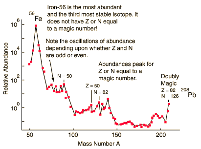Enhanced Abundance of Magic Number NucleiPart of the motivation for the shell model of nuclear structure is the existance of "magic numbers" of neutrons and protons at which the nuclei have exceptional stability, implying some kind of "closed shell". One indication of this stability is the enhanced abundance of isotopes which have a magic number of neutrons or protons. ![]() After Booth & Combley The illustration examines the abundance of elements around iron and above. Our model of heavy element formation involves extraordinary processes in supernovae. Since these nuclei are born in the maelstrom of neutrons and neutrinos in the violent outer reaches of the supernovae, one would expect a statistical advantage for those isotopes which are most stable and therefore have the smallest cross-section for the kind of scattering which would disrupt them. While the peaks in abundance for the magic number isotopes do not appear to be particularly prominent, keep in mind that the vertical scale is logaritmic. The iron-56 is a particularly unique case, as shown by its extraordinary abundance. Iron-56 is an even-even nucleus and therefore expected to be particularly stable because of the Pauli contribution in the liquid drop model, but does not have magic numbers of either N or Z. It is exceeded in binding energy only by nickel-62 (the most stable nuclide) and iron-58. It is near the peak of the binding energy curve, and therefore can be considered to be one of the end points of both nuclear fusion and fission sequences, so perhaps that is the explanation for its extraordinary abundance.