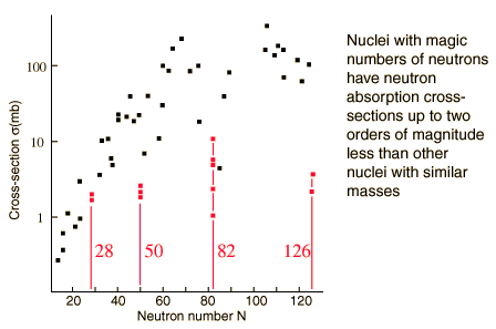 Neutron Absorption Cross-sectionsPart of the motivation for the shell model of nuclear structure is the existance of "magic numbers" of neutrons and protons at which the nuclei have exceptional stability, implying some kind of "closed shell". Part of this evidence comes from absorption cross-sections for neutrons. ![]() After Booth & Combley The stability of those nuclei with magic numbers of neutrons makes them less likely to be excited by neutron bombardment. The probability for absorption of an incident is expressed as an effective cross-section which is presented by the target nucleus to those incoming neutrons. The common unit for cross-sections is the barn, and the vertical axis on the illustration is labeled in millibarns.