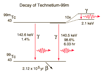 Technetium -99m is produced by bombarding molybdenum 98Mo with neutrons. The resultant 99Mo decays with a half-life of 66 hours to the metastable state of Tc . This process permits the production of 99mTc for medical purposes. Since 99Mo is a fission product of 235U fission, it can be separated from the other fission products and used to generate 99mTc. For medical purposes, the 99mTc is used in the form of pertechnate, TcO4-. The technetium isotope 99mTc is unusual in that it has a half-life for gamma emission of 6.03 hours. This is extremely long for an electromagnetic decay - more typical is 10-16 seconds. With such a long half-life for the excited state leading to this decay, this state is called a metastable state, and that is the reason for the designation 99m. Some aspects of the complex decay of this radioisotope are shown in the diagram below. The dominant decay mode gives the useful gamma ray at 140.5 keV. ![]() While the 140.5 keV gamma transition is labeled as happening 98.6% of the time, not all of those actually emit a gamma ray photon. The process called internal conversion always competes with gamma photon emission. This involves transfer of the energy of the transition to one of the atomic electrons, usually a K, L, or M shell electron. This decay has been studied carefully enough to know the fraction of the decays associated with each pathway.