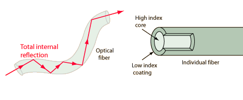 Fiber OpticsThe field of fiber optics depends upon the total internal reflection of light rays traveling through tiny optical fibers. The fibers are so small that once the light is introduced into the fiber with an angle within the confines of the numerical aperture of the fiber, it will continue to reflect almost losslessly off the walls of the fiber and thus can travel long distances in the fiber. Bundles of such fibers can accomplish imaging of otherwise inaccessible areas. ![]()