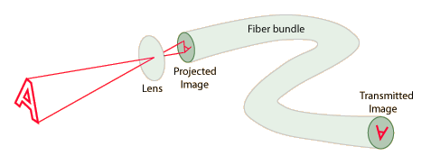 Fiber Optic ImagingFiber optic imaging uses the fact that the light striking the end of an individual fiber will be transmitted to the other end of that fiber. Each fiber acts as a light pipe, transmitting the light from that part of the image along the fiber. If the arrangement of the fibers in the bundle is kept constant then the transmitted light forms a mosaic image of the light which struck the end of the bundle. ![]()