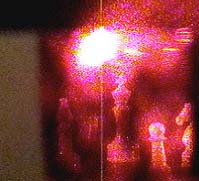 The above image was taken through a transmission hologram. The hologram was illuminated from behind by a helium-neon laser which has been passed through a diverging lens to spread the beam over the hologram.