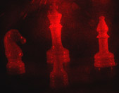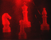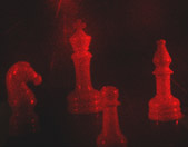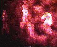 These three images of the same hologram were taken by positioning the camera at three positions, moving from left to right. Note that the pawn appears on the left side of the king in the left photo, but transitions to the right of the king as you sweep your eye across the hologram. This is real parallax, which tells you that the image is truly 3-dimensional. Each perspective corresponds to looking through the hologram at a particular point.