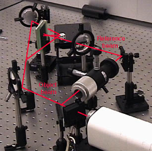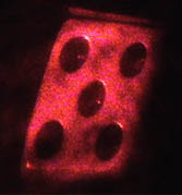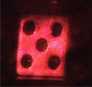Having achieved a brighter, cleaner beam by focusing the first lens on the spatial filter, we were able to get much better coverage of the entire film. The light detector readings were 30 mV for the reference beam and 3.3 mV for the object beam, for a ratio of 9:1. The calculated exposure was 0.382/.033 = 12s, but based on previous experience, exposures were made at 24 and 48 seconds to go one and two stops over the calculated value. Both produced clear, bright holograms, the best achieved to date. The holographic images below were for the 48 s exposure. The image on the left is the regular virtual image viewed through the film. The image on the right is the much larger image viewed from the opposite side of the film, the so-called "real image". It changed perspective drastically as you moved the film. Both were quite bright and had a much easier viewing angle than the previous setup because of the relative orientation of the reference beam. By passing the undiverged laser beam through the hologram, we were able to project two images of the die clearly on white paper.