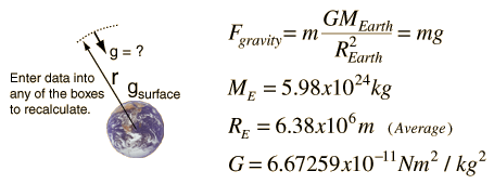 Earth's GravityThe weight of an object is given by W=mg, the force of gravity, which comes from the law of gravity at the surface of the Earth in the inverse square law form: ![]() At standard sea level, the acceleration of gravity has the value g = 9.8 m/s2, but that value diminishes according to the inverse square law at greater distances from the earth. The value of g at any given height, say the height of an orbit, can be calculated from the above expression. Please note that the above calculation gives the correct value for the acceleration of gravity only for positive values of h, i.e., for points outside the Earth. If you drilled a hole through the center of the Earth, the acceleration of gravity would decrease with the radius on the way to the center of the Earth. If the Earth were of uniform density (which it is not!), the acceleration of gravity would decrease linearly to half the surface value of g at half the radius of the Earth and approach zero as you approached the center of the Earth.