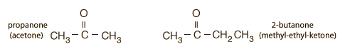 KetonesA ketone is a compound containing a carbonyl group with two hydrocarbon groups attached to it. ![]() Formal names for ketones include the prefix from the alkyl group and the suffix -one. Two of the simplest are propanone, marketed under the name acetone, and 2-butanone, marketed under the name methyl ethyl ketone or MEK. ![]() An important ketone is fructose, or fruit sugar.