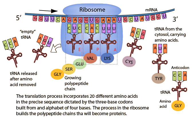 The above is a grossly oversimplified sketch of the translation process as it applies in a prokaryotic cell. See Karp for a more detailed treatment. The essentials that this illustration seeks to convey are that the ribosome uses the detailed sequence of codons on the mRNA and matches those codons to tRNA molecules which carry the corresponding amino acids. The translation process builds a polypeptide with the precise sequence of amino acids specified by the mRNA pattern. In eukaryotic cells, the translation process has many similarities but is of even greater complexity.