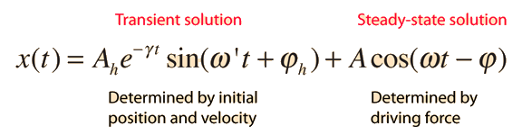 Driven OscillatorIf a damped oscillator is driven by an external force, the solution to the motion equation has two parts, a transient and a steady-state part, which must be used together to fit the physical boundary conditions of the problem.