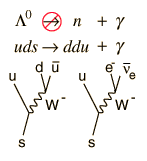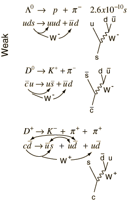 The weak interaction decays are more complex and have more possibilities. They involve quark transformations involving the W particles to change quark flavors. Besides tracking the quark content of the particles, it is helpful to examine the Feynmann diagrams for W decay to see what the usual decay products are. With those tools, the first two decays above are fairly straightforward. The third requires a bit more gymnastics with the quarks. It requires the production of a quark-antiquark pair to proceed as indicated. |