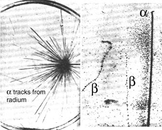 | The images at left are typical of those obtained by Wilson (C. T. R. Wilson, Proc. Roy. Soc. (London), 87, 292 (1912)). The cloud chamber provided a device for studying the collisions between free particles and the decay of particles in flight.