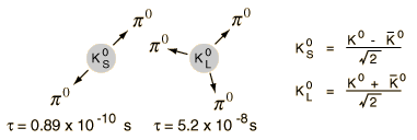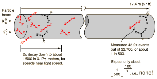 Cronin and Fitch Experiment with KaonsIn the study of neutral kaons, two particle species were found, having apparently identical masses but very different lifetimes. These particles have different decay modes. ![]() In 1964, Cronin and Fitch performed a beam experiment in which they measured the decay of pions at the end of a 57 foot beamline. Given the disparity of the lifetimes of the two kaon species, you expect to see only the long-lived version at the end of the beam tube, but they found about 1 in 500 decays to be 2-pion decays, characteristic of the short-lived species. ![]() The short-lived particle should not be observable more than a few centimeters down the beam line. To show that, suppose we calculate the time required to drop to 1/500 the original population. With the stated lifetime, the halflife calculation gives a time of 5.5 x 10-10 seconds. At nearly the speed of light, this would give a distance of about 17 centimeters, only 1/100 the length of Cronin and Fitch's beam tube. The problem with this number is that it ignores relativistic time dilation, and the lifetime as seen in the laboratory frame is dilated by the relativity factor γ (at 0.98c, γ =5). The revised distance is then 17γ cm, so even at 0.98c the population would be down by a factor of 500 by the time you got a meter down the beam tube. So for any expected particle velocity, you would expect all of them to have decayed long before you get to the end of the beam line. This experiment showed that there was a small CP violation in the kaon decay, so the kaon has played a central role in the discussions of these symmetries since that time.