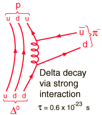 If such a decay pathway is available to a particle, it decays very quickly - on the order of 10-23 seconds. Another example is the decay Δ0 --> p+ + π-. Note that the delta baryon Δ0 has the same quark makeup as the neutron, but its mass is much larger. Its mass is sufficient for this decay to be energetically favorable. The four varieties have similar masses and are said to be an isospin quartet. |