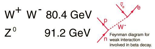 Intermediate Vector BosonsThe W and Z particles are the massive exchange particles which are involved in the nuclear weak interaction, the weak force between electrons and neutrinos. They were predicted by Weinberg, Salam, and Glashow in 1979 and measured at CERN in 1982. The prediction included a prediction of the masses of these particles as a part of the unified theory of the electromagnetic and weak forces, the electroweak unification. "If the weak and electromagnetic forces are essentially the same, then they must also have the same strength. The fact that the experimentally observed strengths seem quite different is attributed to the masses of the W and Z particles-under certain conditions a force of large strength can have the appearance of a force of small strength if the particle that carries the force is very massive. Theoretical calculations show that at a fundamental level the weak and electromagnetic forces have the same strength if the W and Z particles have masses of 80 and 90 GeV respectively." The masses measured at CERN were 82 and 93 GeV, a brilliant confirmation of the electroweak unification. The experiments at CERN detected a total of 10 W bosons and 4 Z bosons. In the extended experiment at Fermilab's Tevatron known as "Run 1" (1992-96), the D0 detector facility measured over 100,000 W particles. The D0 value for the mass of the W is 80.482 +/- 0.091 GeV. Current values combining the experiments at the Tevatron and at CERN's LEP electron-positron collider are MW = 80.41 +/- 0.18 GeV and MZ = 91.1884 +/- 0.0022 GeV. |