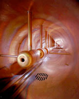 A linear accelerator is used as the second stage of the accelerator chain leading to the Tevatron at Fermilab. Negative hydrogen ions are accelerated to 750 keV by a Cockroft-Walton accelerator and then enter the linear accelerator, approximately 150 meters long. Oscillating electric fields accelerate the negative hydrogen ions to 400 million electron volts (400 MeV). Before entering the third stage (the booster), the ions pass through a carbon foil, which removes the electrons, leaving only the positively charged protons.