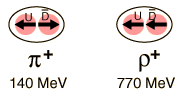 The rho meson has the same quark composition as the pion and can be considered to be an excited state of the pion. The fact that its mass is five and one half times the mass of the pion illustrates the difficulties of assigning mass to the quarks. Hadron masses depend upon the dynamics inside the particle, and not just upon the quarks contained. The quark modeling of the pion and rho classifies the pion as a pseudoscalar meson with zero angular momentum. The quarks have spin 1/2 and the spins are "paired" or anti-aligned. In the rho meson, a vector meson, the angular momentum is j=1, indicating parallel spins. Under the influence of the strong color force, the state with spins aligned has a higher energy which shows up as a larger mass energy. The analogy to the higher energy of aligned spins in a magnetic field (Zeeman effect) is instructive, but this difference in energy associated with the color force is enormous.