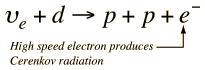 Sudbury Neutrino ObservatoryThe new Sudbury Neutrino Observatory (SNO) consists of a 1000 metric ton bottle of heavy water suspended in a larger tank of light water. The apparatus is located in Sudbury, Ontario, Canada at a depth of about 2 km down in a nickel mine. A 18 m diameter geodesic array of 9,500 photomultiplier tubes surrounds the heavy water to detect Cerenkov radiation from the neutrino interaction which dissociates deuterium:
