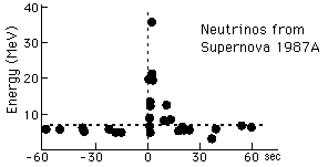 Detection of Supernova NeutrinosSince the neutrino can pass through the entire Earth without interaction, it takes specialized techniques to detect one. After being postulated by Fermi in 1930 to explain anomalies in beta decay, they were not actually detected until 1953 by Reines and Cowan. Detection of neutrinos is now well developed and a classic opportunity for neutrino detection occurred with Supernova 1987A. A burst of ten neutrinos was detected within a time interval of about 15 seconds at a neutrino detector deep in a mine in Japan. They had to penetrate the Earth to get to the detector.