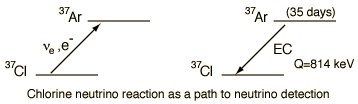 The Solar Neutrino TelescopeRaymond Davis of Brookhaven National Laboratory constructed a neutrino detector 1.6 km underground in the Homestake Gold Mine in Lead, South Dakota. The detector consists of a 378,000 liter tank of perchloroethylene, which is further isolated by being submerged in water. Theoretical expections were about one neutrino-chlorine interaction per day, but the measured solar neutrino events were about a third of that, raising serious questions about the abundance of solar neutrinos (the Solar Neutrino Problem). The detection of neutrinos by this instrument was based on the interaction of neutrinos with chlorine nuclei to produce argon. The argon can be removed from the tank and measured so that the number of neutrinos captured in a given time interval can be determined. ![]() The argon decays back to the chlorine isotope from which it was created by the process of electron capture. The detection of this transition is aided by the definite energy of the x-ray emitted during the electron capture process. This mine experiment was able to detect about 15 argon atoms a month, according to Simpson.
