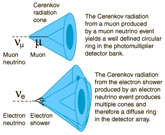 The distinctive characteristic of the heavy water observatory is that it can measure both the electron neutrino flux and the total neutrino flux (electron, muon and tau neutrinos). It should allow them to determine whether neutrinos change flavors. If so, it could explain the solar neutrino problem and would show that the neutrinos have mass. SNO began operating in production mode in October, 1999, and as of Summer 2000 had collected a sizable number of neutrino events both from the sun (the main focus of the experiment) and from atmospheric events with pions and muons. The Cerenkov cones of the solar neutrinos center about the direction opposite the sun, showing about the same flux at night as during the day. This was an expected result, since the mean free path of a neutrino in matter is about 22 lightyears in lead and having the earth in the path makes little difference. A sizable number of the atmospheric neutrino events come from below, having traveled all the way through the earth and forming the Cerenkov cone in the photomultiplier tubes at the top of the spherical heavy-water ball. These Cerenkov cones are scattered all around the sphere, while the solar ones of course show a precise anti-solar direction. The depth of the detector protects it from the intense bombardment of cosmic ray muons which reaches the earth's surface. The detector measures only about 70 muon events per day, and they are easily distinguished from neutrino events since the muon interacts by the electromagnetic interaction and produces a much larger signal in the detector array. In order to detect the ring of light which is the signature of Cerenkov radiation, the responses of all the photomultiplier tubes (PMTs) are monitored with a very short time scale. In order to be counted as an "event" in the detector, at least 20 PMTs must be triggered within an interval of 100 nanoseconds.