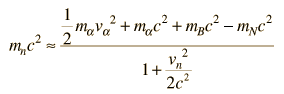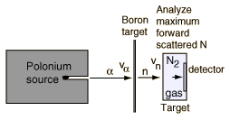 The task which remained for Chadwick was that of determining the mass of the neutral particle. He chose to bombard boron with alpha particles and analyze the interaction of the neutral particles with nitrogen. These particlular targets were chosen partly because the masses of boron and nitrogen were well known. Conservation of energy applied to the combined interactions gives the following expressions: ![]() Solving for the mass energy of the neutron gives ![]() The remaining unknown on the right hand side of the equation is the speed of the neutron. Assuming that the neutron mass was close to that of the proton, Chadwick bombarded hydrogen atoms with his produced neutrons to learn the speed of the protons after the collisions. Then setting the neutron speed equal to those proton speeds, he used the above energy expression to get a neutron mass of 938 +/- 1.8 MeV. With a consistent set of experiments, Chadwick had obtained the first value for the neutron mass which compared well with the presently accepted value of 939.57 MeV.