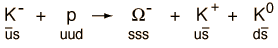 | Omega | Ω- | sss | 1672 | 3/2 | +1 | -3 | 0.82 x10-10 | Ξ0π-, Λ0K- |