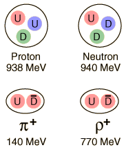 The difference between a pion and a rho is the spin alignment of the quarks. The pion is a pseudoscalar meson with zero angular momentum. The quarks have spin 1/2 and the spins are "paired" or anti-aligned. In the rho meson, a vector meson, the angular momentum is j=1, indicating parallel spins. Under the influence of the strong color force, the state with spins aligned has a higher energy which shows up as a larger mass energy. The analogy to the higher energy of aligned spins in a magnetic field (Zeeman effect) is instructive, but this difference in energy associated with the color force is enormous. ![]() Georgi comments "There is good reason to believe that most of the mass of the quark that we 'see' in the mass of the proton or the rho is a dynamical effect of quark confinement, that the u and d quarks in the underlying QCD theory actually have masses much smaller than 1/3 the mass of the proton." |
